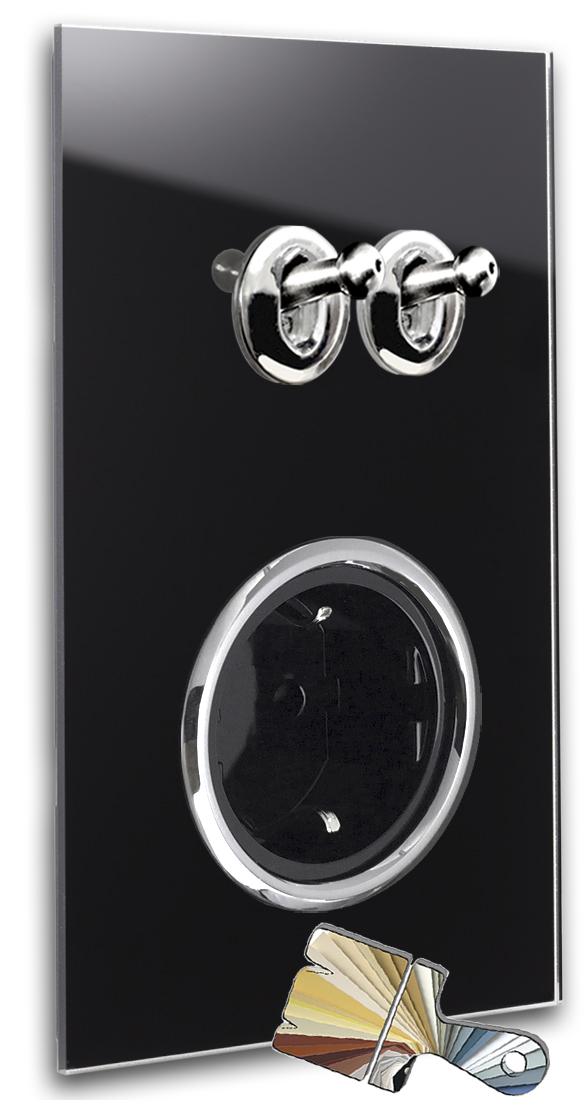2 Kippschalter Chrom, 1 schwarze Steckdose. Glas-Optik mit Farrow Ball Farbe