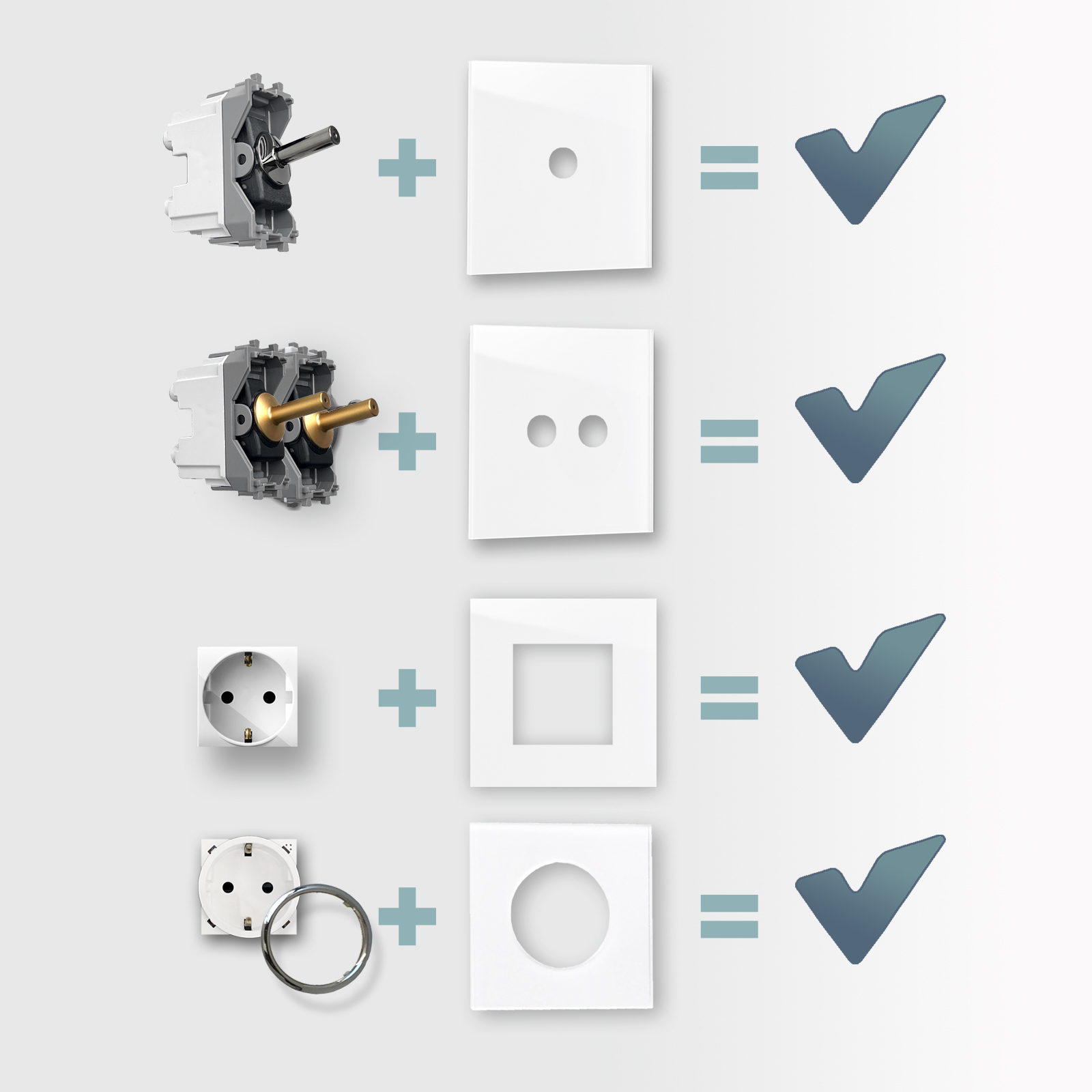 Mit einer Frontblende und den entsprechenden technischen Einsätzen haben Sie bereits alles, was Sie für ein komplettes Produkt brauchen. Installationsmaterial ist im Lieferumfang enthalten.
